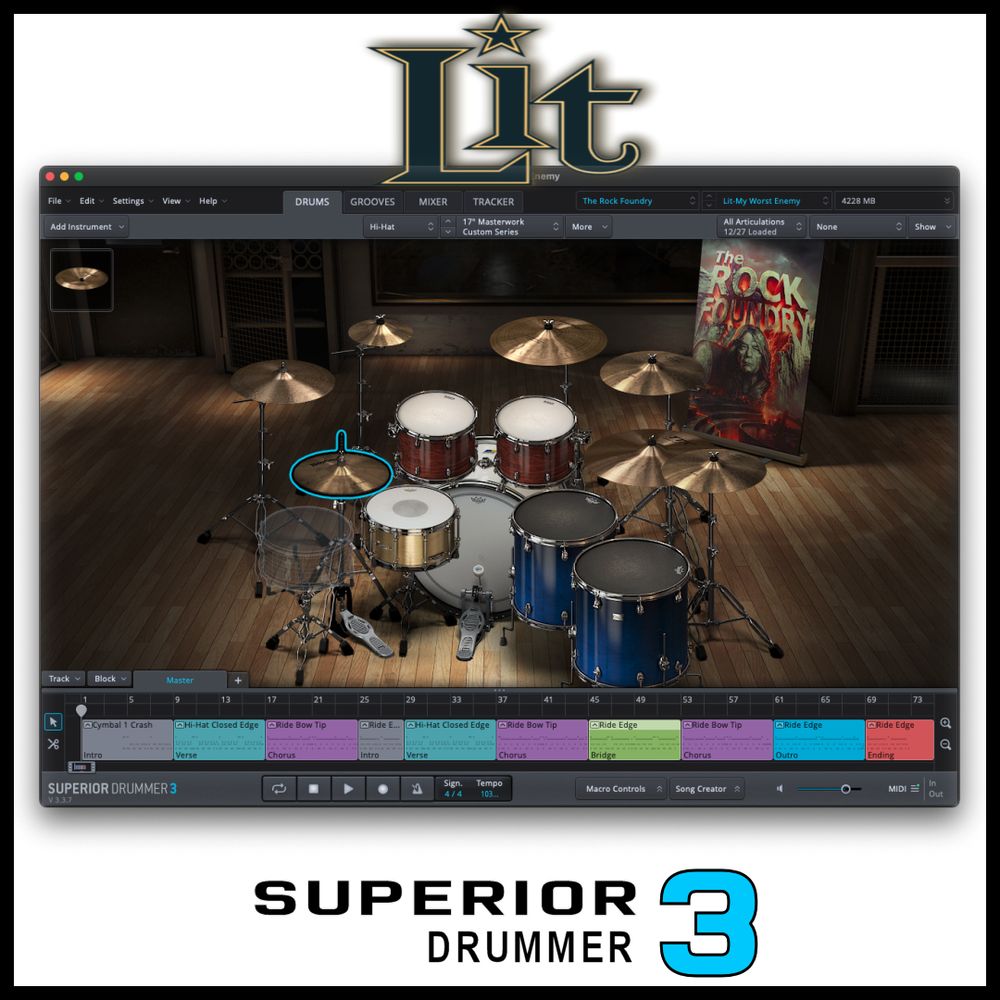This download will be the complete Superior Drummer 3 tracked MIDI performance in .sd3p format created and played by me, as displayed on my YouTube channel, using the following Superior Drummer 3 libraries: