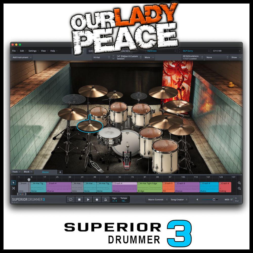 This download will be the complete Superior Drummer 3 tracked MIDI performance in .sd3p format created and played by me, as displayed on my YouTube channel, using the following Superior Drummer 3 libraries: